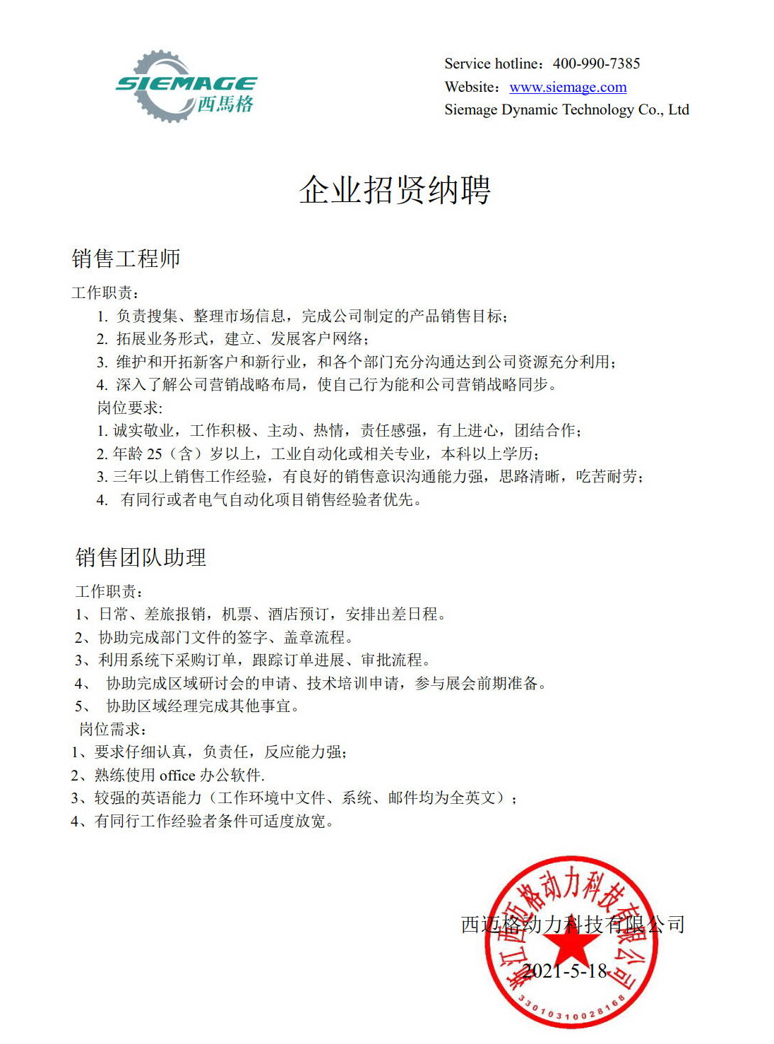 西馬格中國公司證招銷售工程師及銷售處理多名,歡迎來電咨詢!