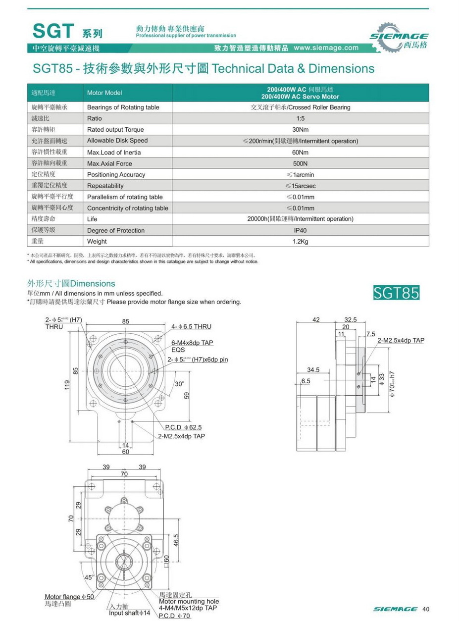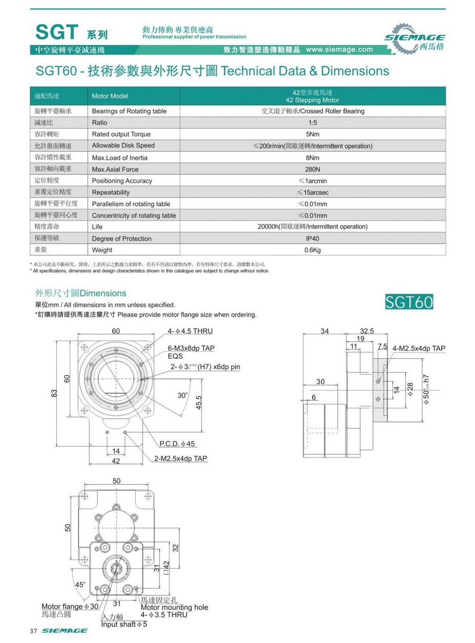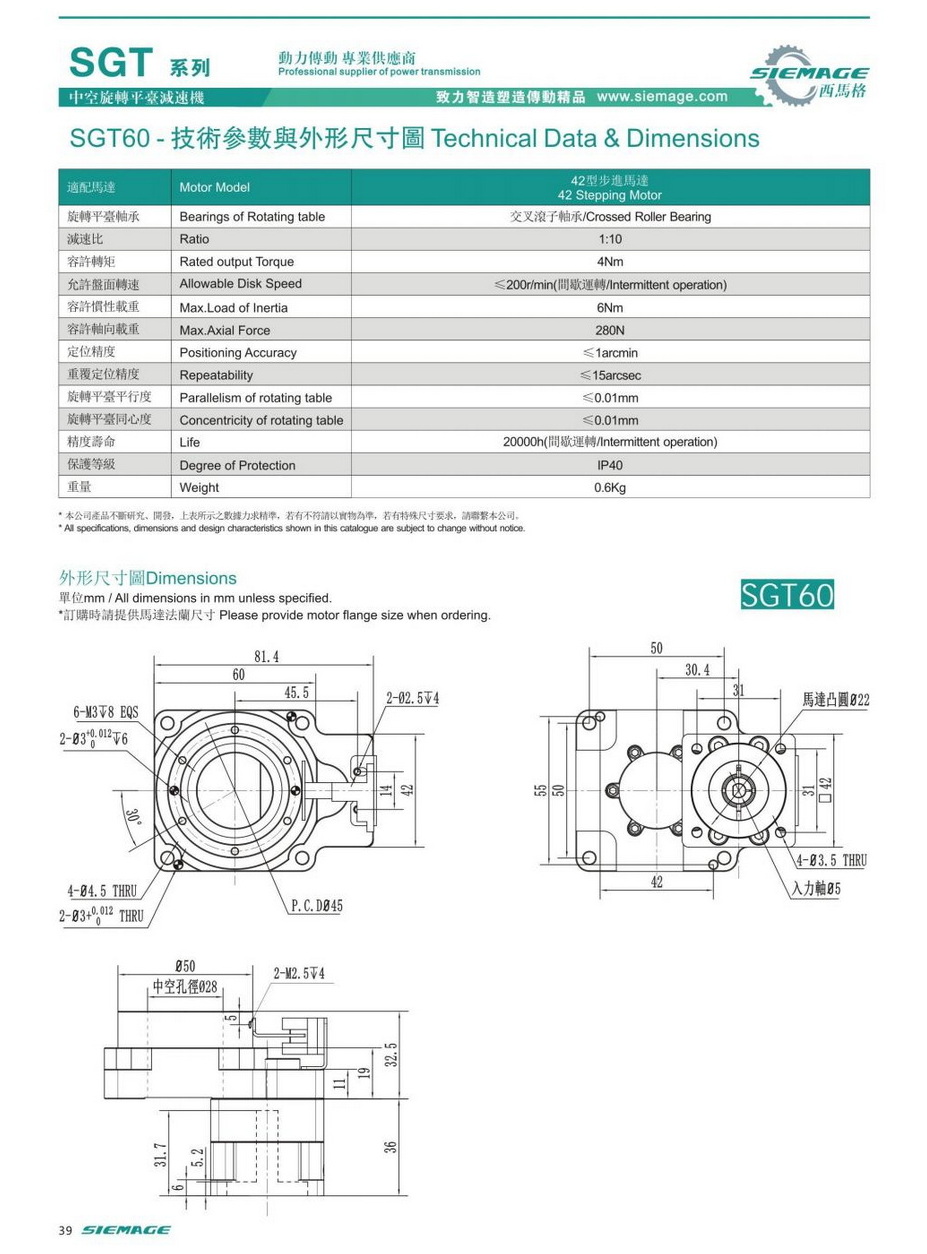 西馬格中空旋轉(zhuǎn)平臺SGT60,可配各品牌伺服電機,50/100W伺服馬達,各廠家42型步進馬達,步進電機。減速比有1:5,1:10,1:18等。