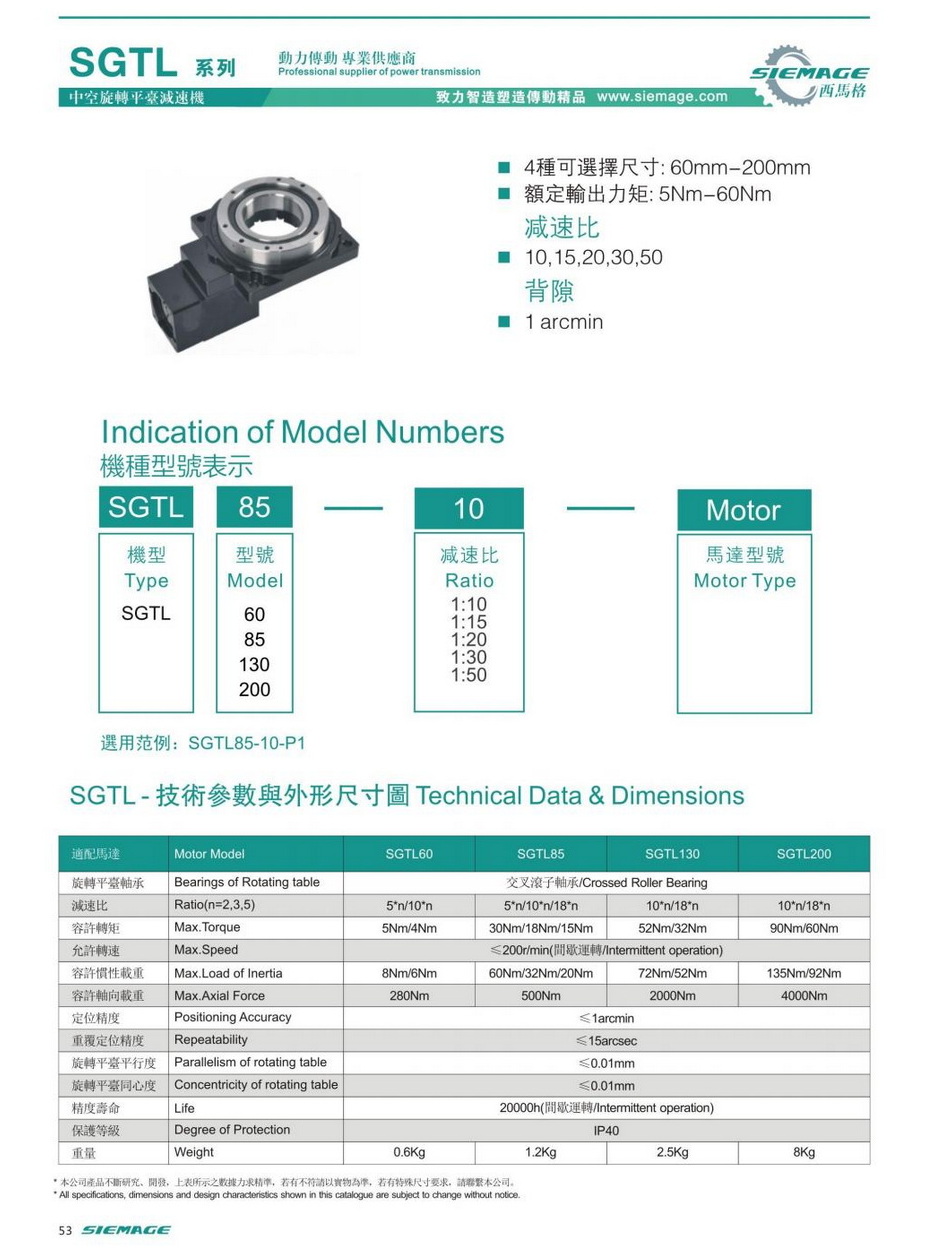 西馬格直角中空旋轉(zhuǎn)平臺(tái)型號(hào)SGTL60,SGTL85,SGTL130,SGTL200.可配各品牌伺服電機(jī),伺服馬達(dá),各廠家步進(jìn)馬達(dá),步進(jìn)電機(jī)。減速比有多種選擇。