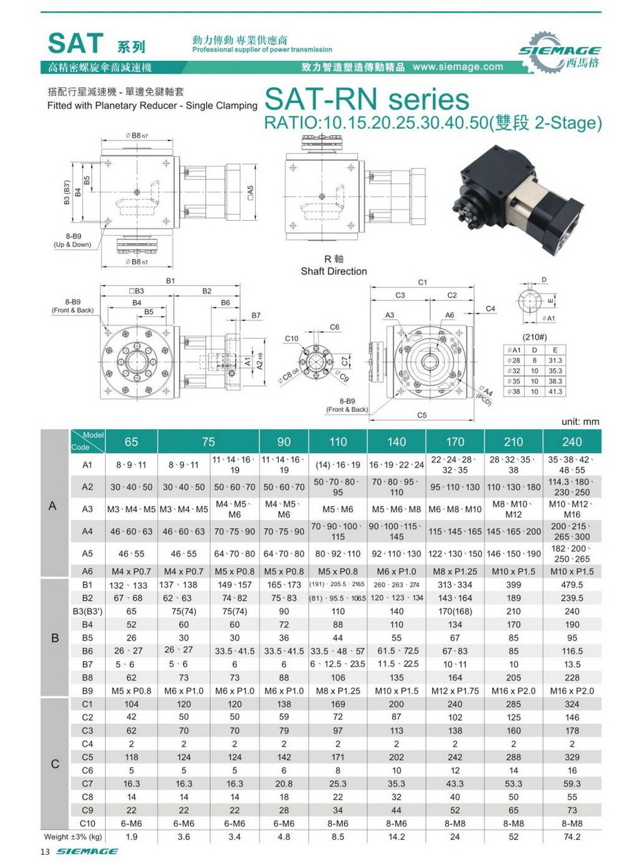 螺旋錐齒輪減速機(jī)雙級(jí)的型號(hào)有SAT65,SAT75,SAT90,SAT110,SAT140,SAT170,SAT210等,減速比有1:10,1:15,1:20,1:25,1:30,1:40,1:50等,入力可配各種伺服電機(jī),步進(jìn)電機(jī),直流電機(jī)等。螺旋錐齒輪減速機(jī)雙級(jí)入力軸及出力軸均可特殊加工,訂制,滿足各種需求。