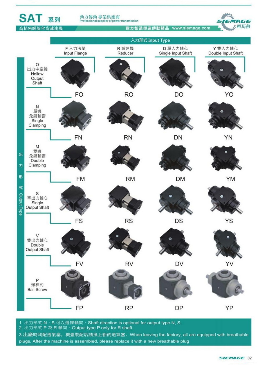 西馬格螺旋傘齒輪減速形式有SAT-FO,SAT-FN,SAT-FM,SAT-FV,SAT-FP,SAT-RO,SAT-DO,SAT-YO,SAT-RN,SAT-RM,SAT-RS,SAT-RV,SAT-RP,SAT-DN,SAT-DM,SAT-DV,SAT-YS,SAT=YV等24種之種,滿足各裝安裝需求。